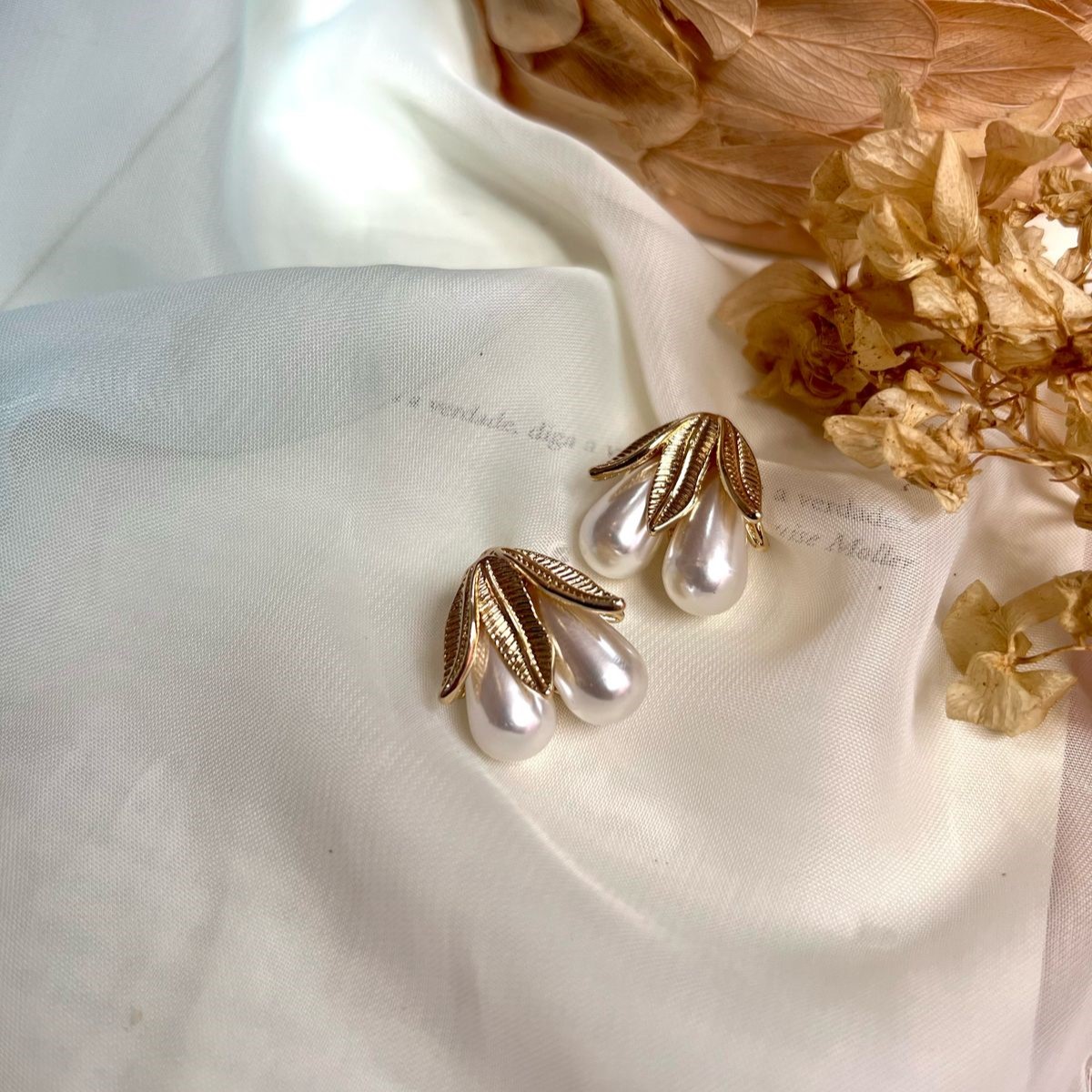 Este brinco combina a delicadeza das folhas douradass com a sofisticação das pérolas em formato gota.
