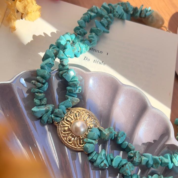 Colar elegante e marcante, perfeito para adicionar um toque de cor e estilo ao seu look. Apresenta uma corrente de cascalhos de resina em tons de azul turquesa, que proporcionam um visual orgânico e vibrante. O destaque da peça é um pingente redondo dourado com detalhe de pérola cravada ao meio, adicionando um toque étnico e sofisticado.