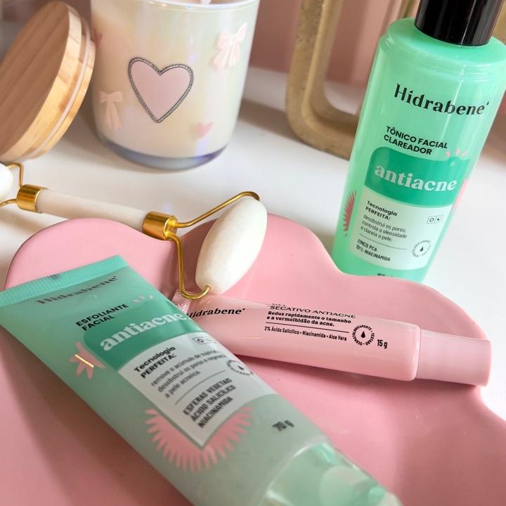 A Linha Antiacne de Hidrabene foi desenvolvida para tratar todos os aspectos da pele acneica, interrompendo o ciclo da acne com ativos que, juntos, promovem o controle da oleosidade e o clareamento de marcas, além de uma poderosa prevenção e tratamento da acne. Suas fórmulas são enriquecidas com ativos reconhecidos por sua eficácia, como Ácido Salicílico, Niacinamida, Argila Verde e Ácido Hialurônico, responsáveis por garantir um cuidado profundo sem causar agressões ou ressecamento à pele. Com texturas suaves e fórmulas hipoalergênicas, os produtos são indicados para pessoas a partir dos 16 anos.