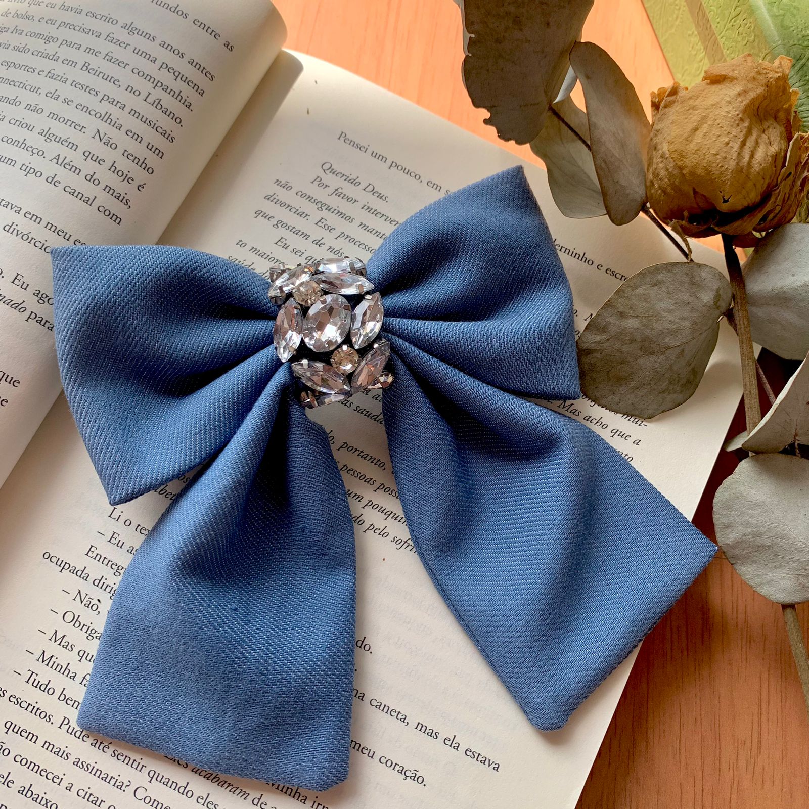 Os laços são o momento! Aquele acessório cheio de personalidade e beleza que nunca vai passar despercebido pelos olhares mais atentos. Feito em um tecido que remete ao jeans, o nosso Laço Luiza é super estruturado. O encanto fica por conta das aplicações dos cristais, todos bordados à mão. Uma joia, não é?