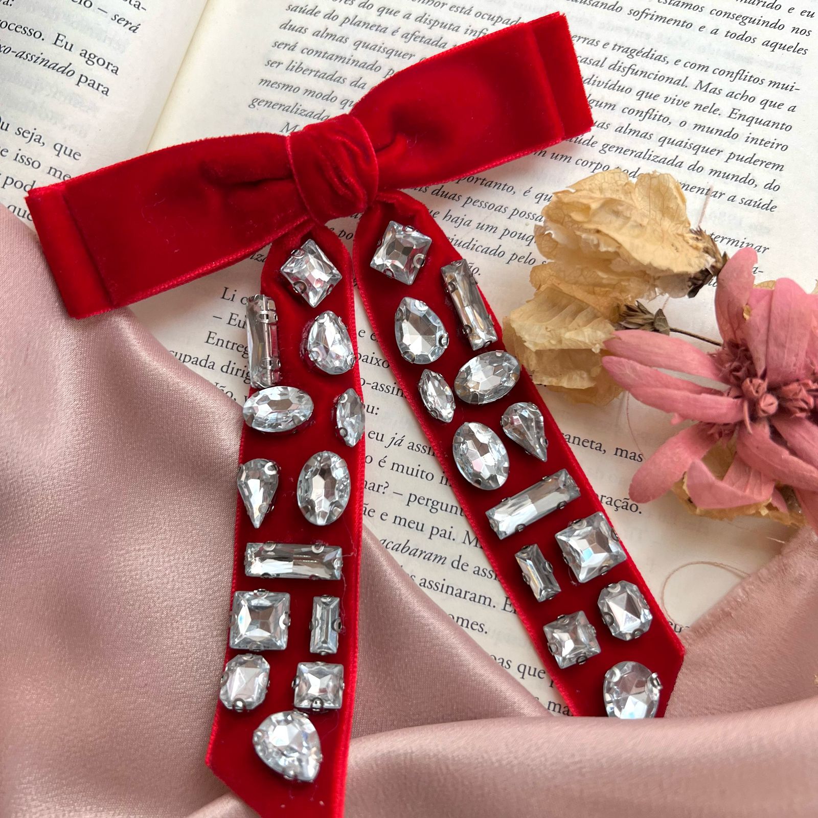 Laço vermelho com detalhes em cristais bordados. Com prendedor em presilha super confortável, impedindo que os fios de cabelo quebrem.