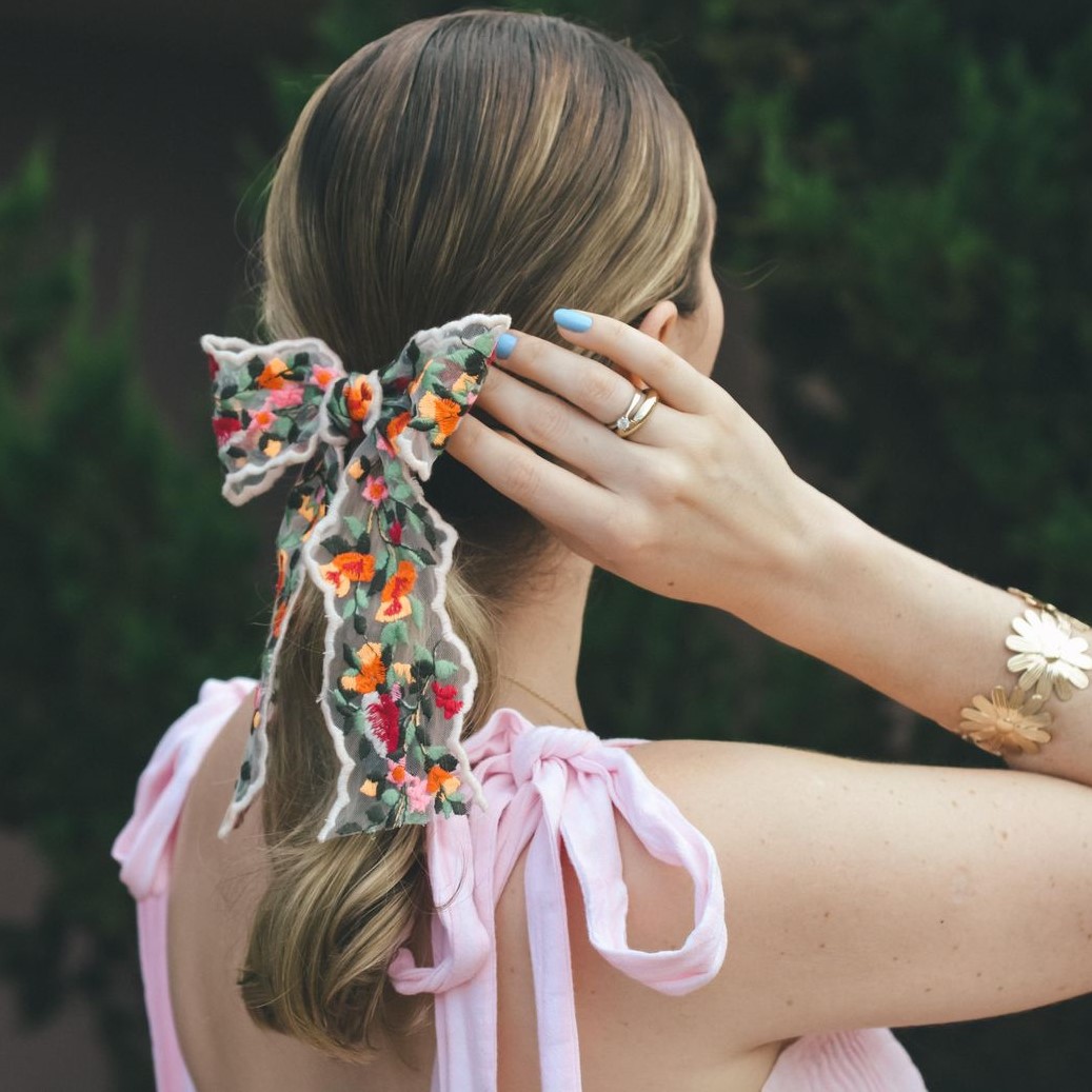 Atenção máxima: o tule é um dos tecidos que seguirá performando muito bem nessa estação! Por aqui, resolvemos somar sua leveza delicada com o bordado de flores e o transformamos em um laço lindíssimo! Vale ressaltar: o acabamento bordado das laterais é feito com uma linha rosa clarinha. Lindo demais né? |