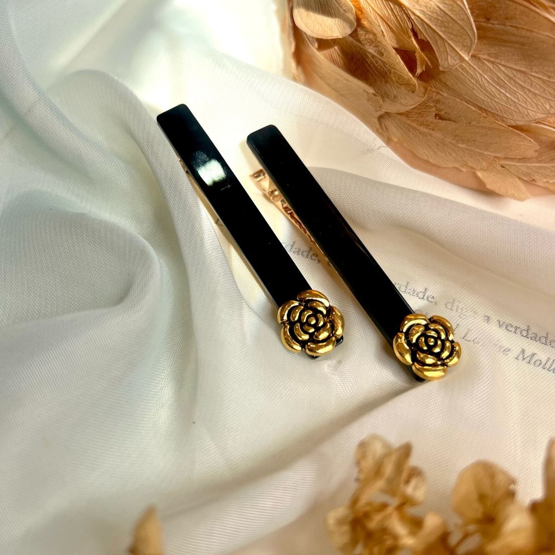 As peônias são as nossas queridinhas. Sempre presente em nossos acessórios, ela chega nessa versão delicada e clássica. Ela é aplicada em um bico de pato de acetato preto. Delicado, prático e elegante.