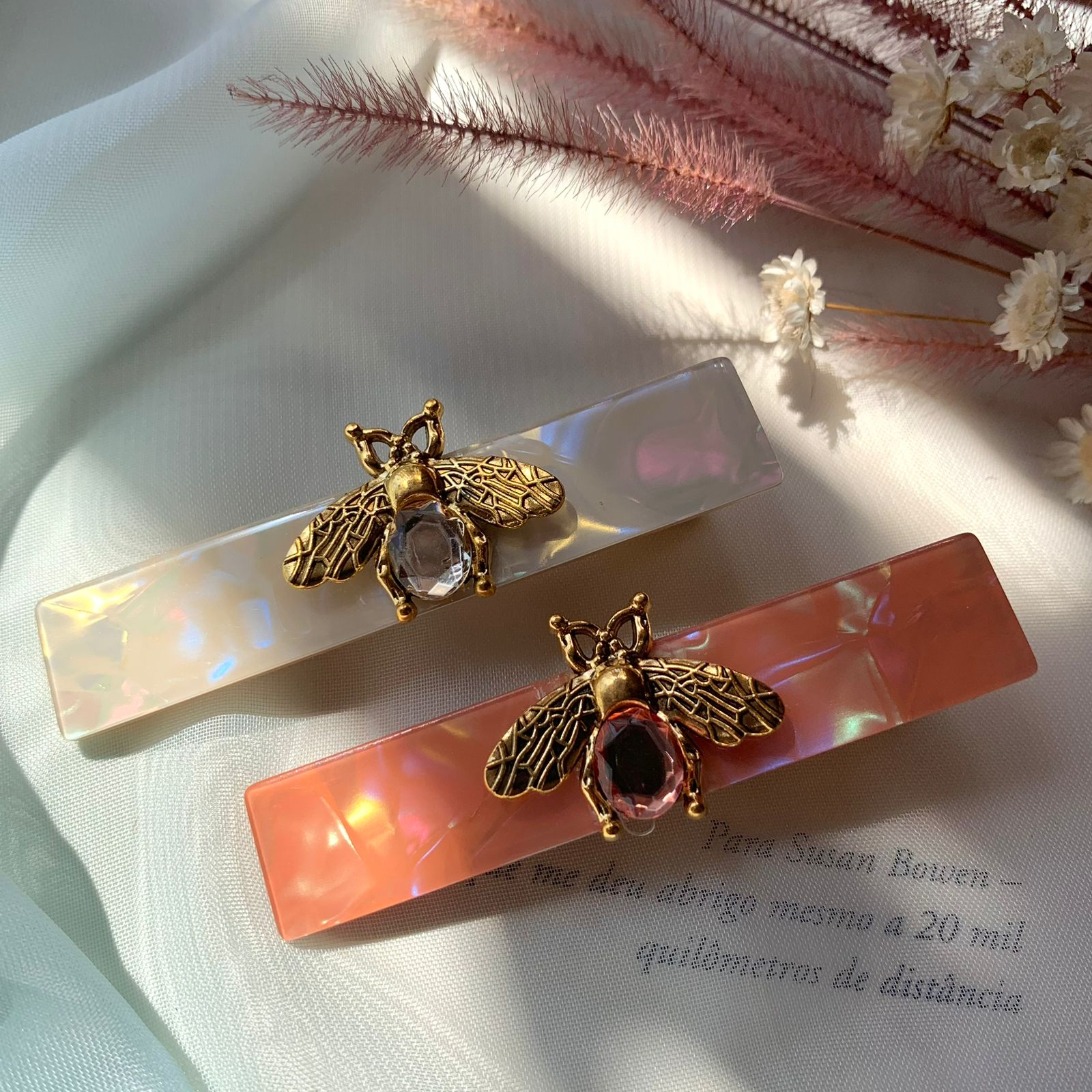 Toda magia da nossa presilha Celine em uma peça sofisticada e elegante. Toda atenção para a abelha feita no metal dourado com detalhes bem particulares: as asas, que tem as nervuras desenhadas e o corpo feito com uma pedra de cristal colorida. Tudo isso para dizer que essa presilha ficou maravilhosa na base de acetato e vai ficar mais linda ainda no seu cabelo.