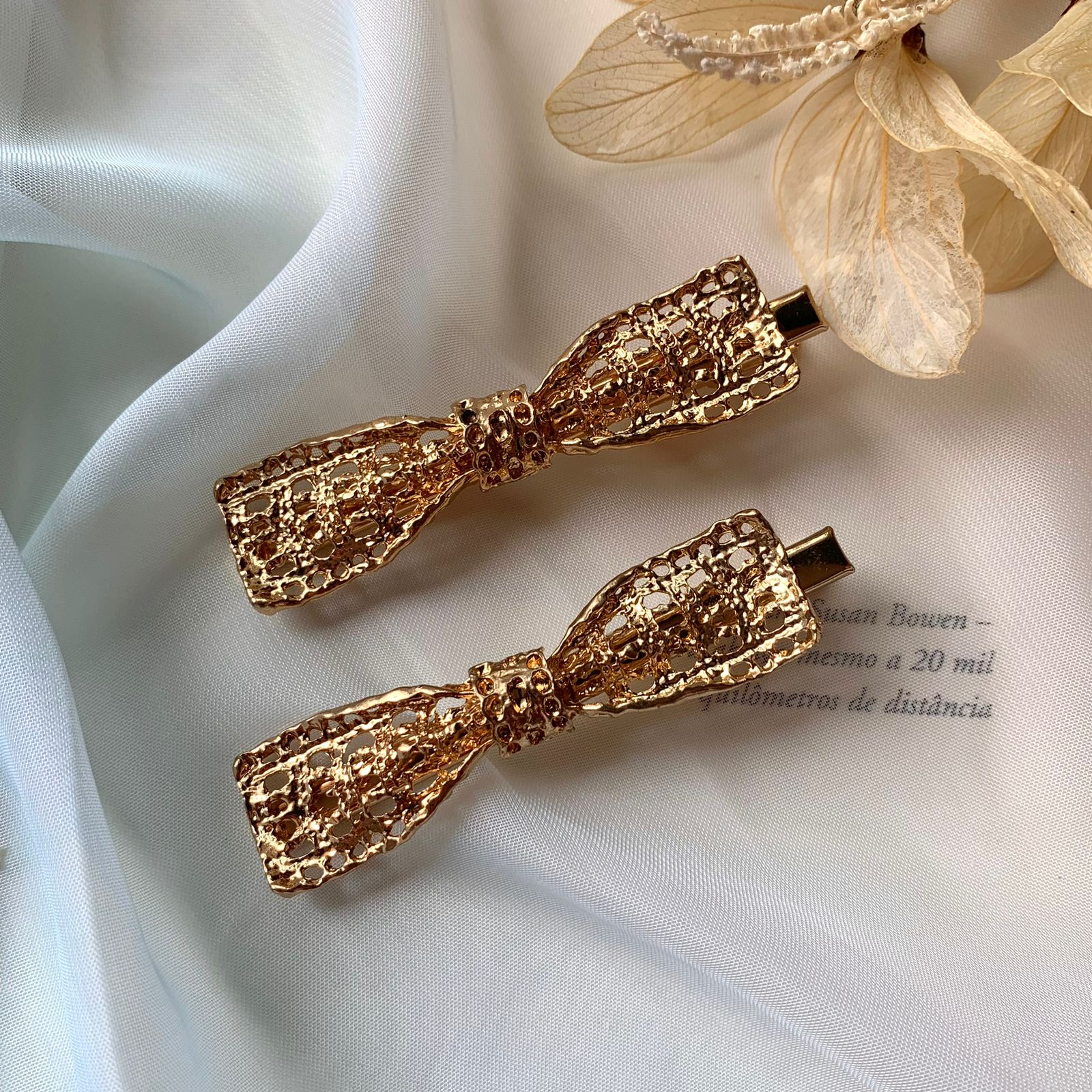 Os laços são a grande tendência do momento! Por aqui, ele chega nessa versão metalizada cheio de relevos e texturas. No bico de pato, o acessório fica incrível para ser usado na lateral do cabelo ou em mechas puxadas para trás.
