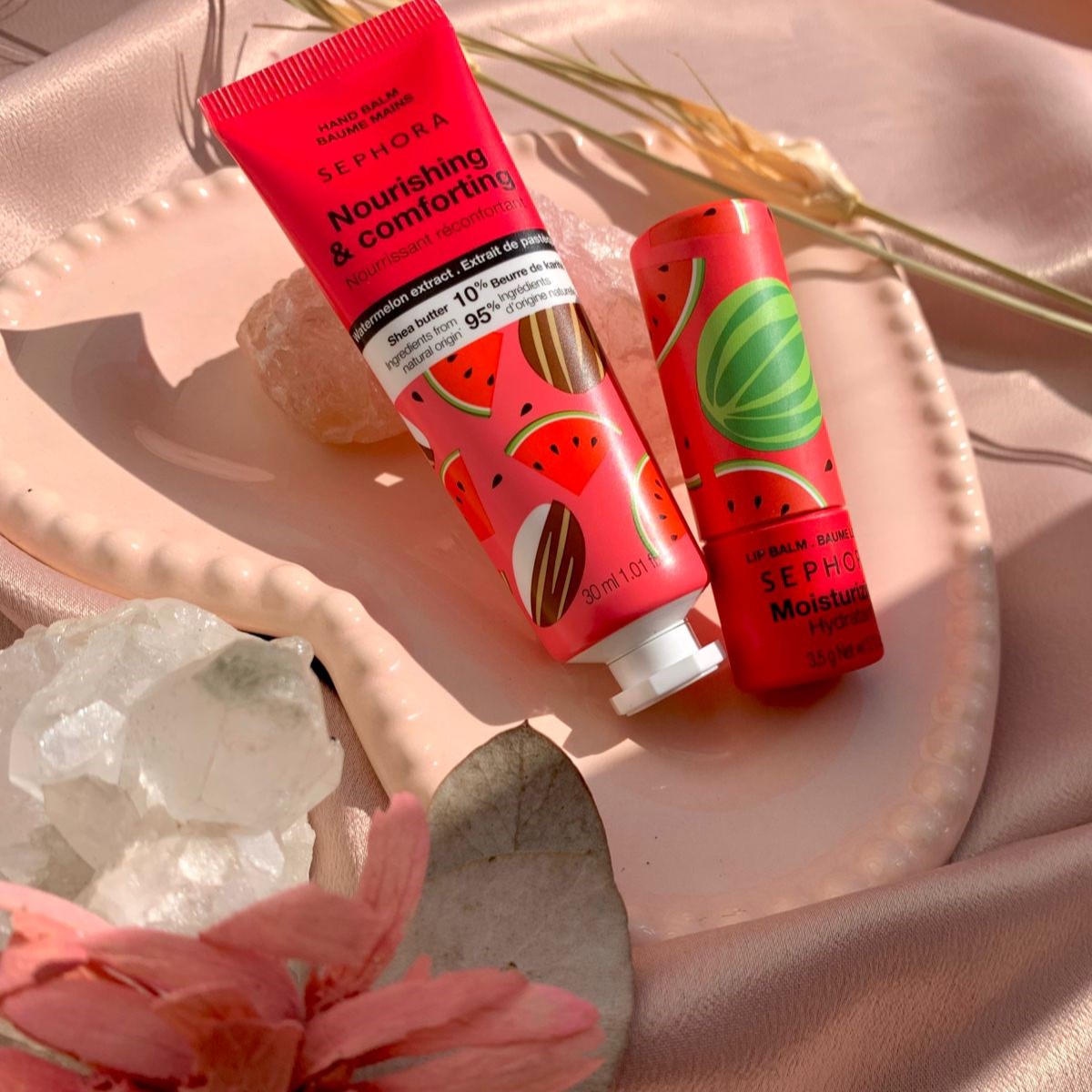 O conjunto de cuidados com a melancia edição limitada da Sephora Favorites inclui um bálsamo labial e um bálsamo para as mãos. Os principais recursos deste produto são sua fragrância refrescante de melancia e sua fórmula hidratante. Benefícios incluem lábios macios e hidratados, além de mãos suaves e nutridas.